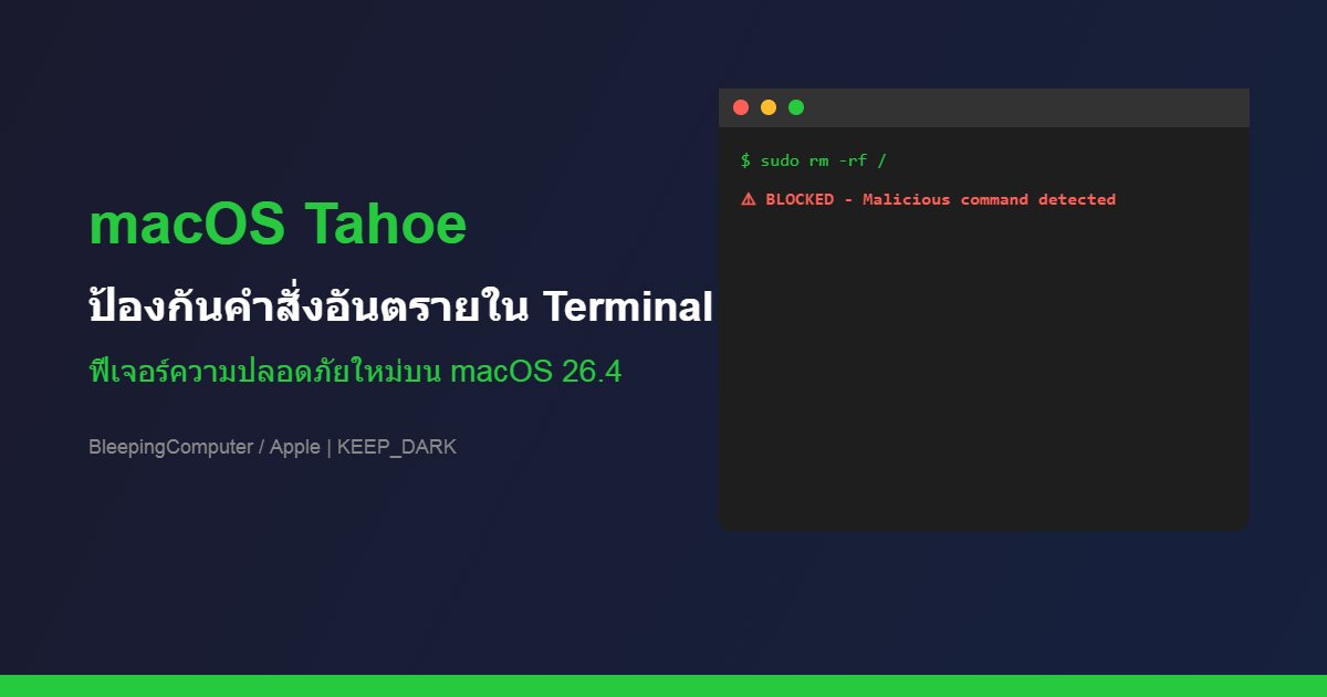 Apple เปิดตัวฟีเจอร์ความปลอดภัยใหม่ใน macOS Tahoe 26.4 ที่จะบล็อกการวาง (Paste) และรันคำสั่งที่อาจเป็นอันตรายใน Terminal โดยอัตโนมัติ พร้อมแจ้งเตือนผู้ใช้เกี่ยวกับความเสี่ยงที่อาจเกิดขึ้น