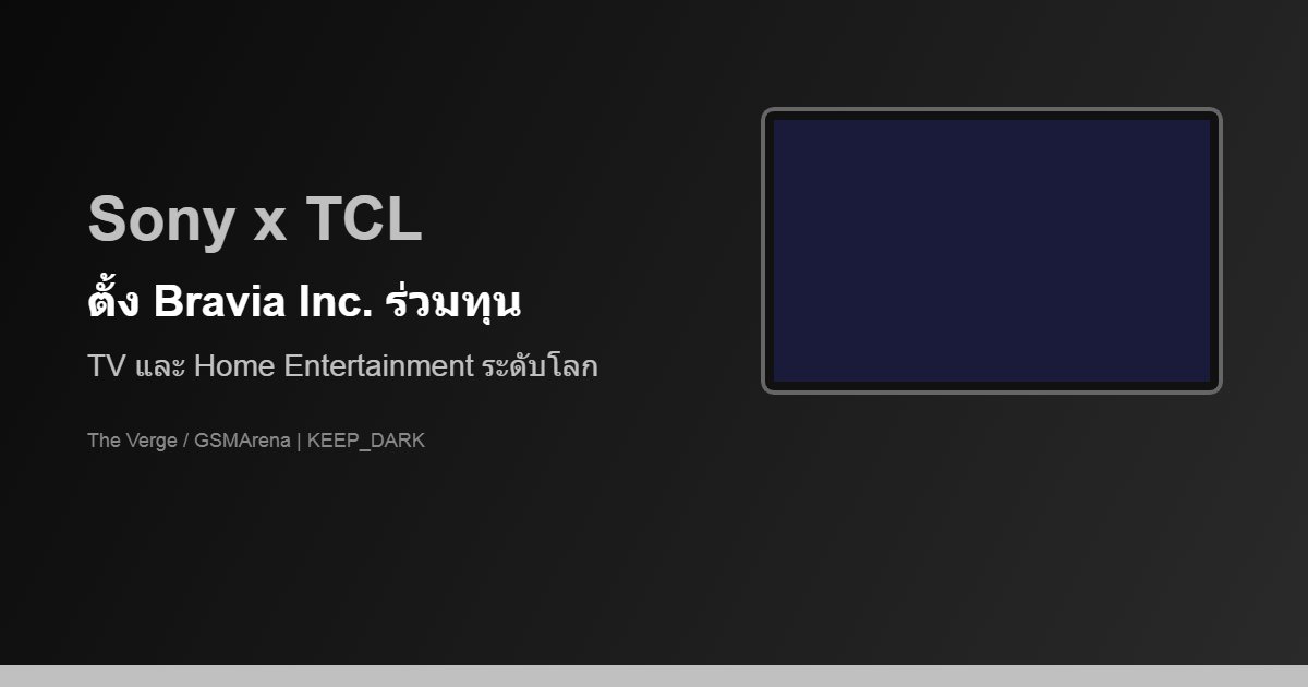 Sony และ TCL ลงนามข้อตกลงจัดตั้งบริษัทร่วมทุนใหม่ในชื่อ “Bravia Inc.” โดย Sony จะถือหุ้น 51% เตรียมเริ่มดำเนินงานในเดือนเมษายน 2027 บริษัทใหม่จะดูแลธุรกิจ Home Entertainment ของ Sony ทั้งหมด